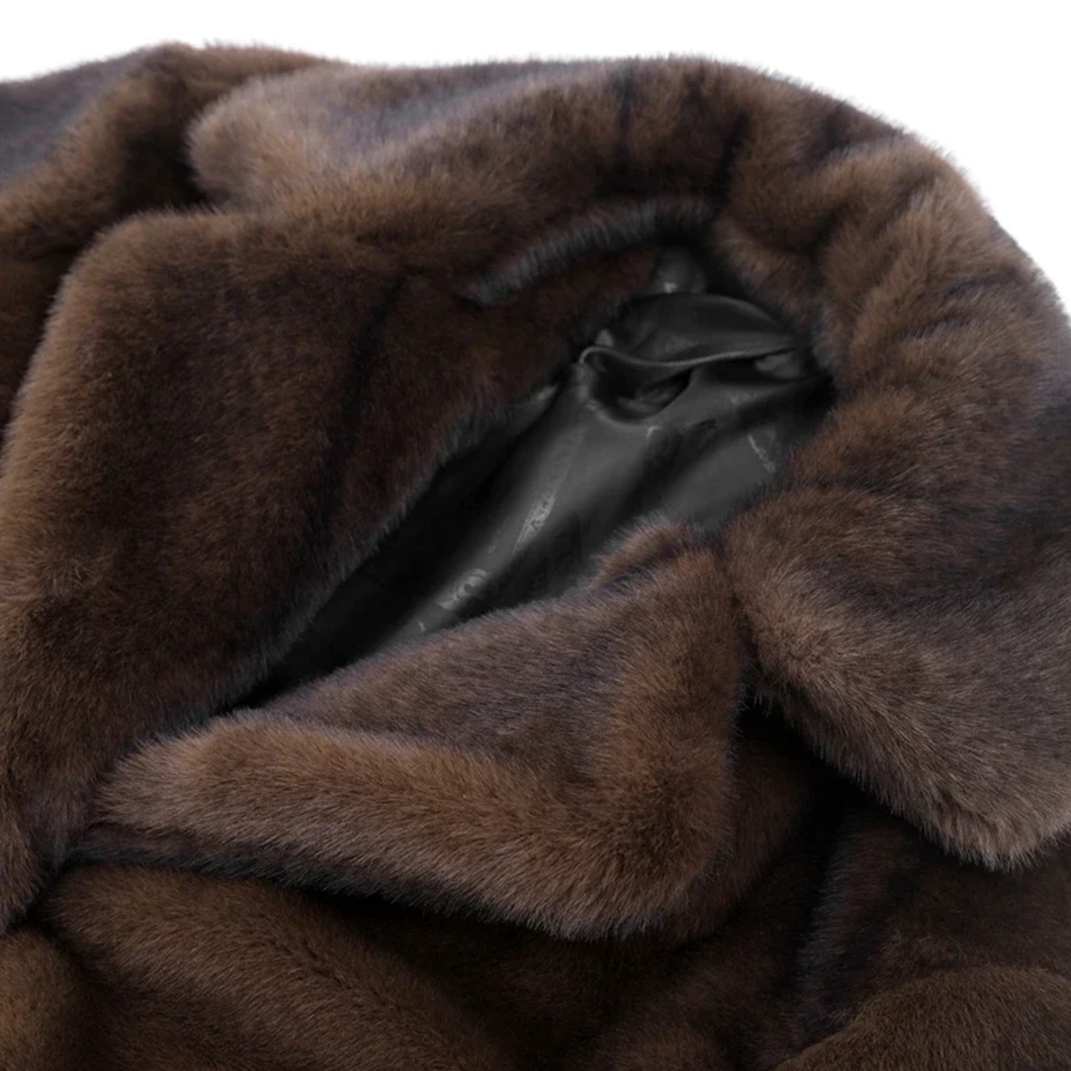 Crafted from dense faux fur with a satin inner lining, it balances warmth, durability, and effortless elegance.